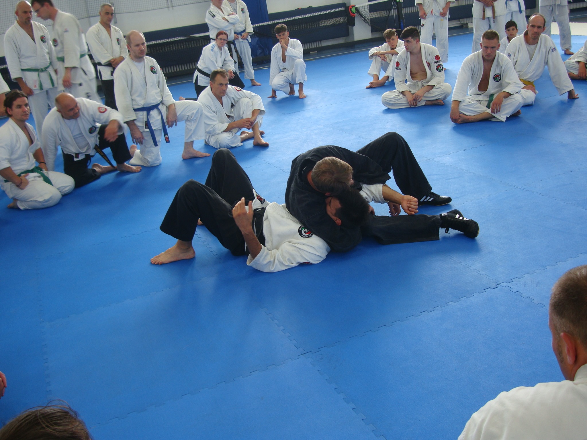 Délután a földharc tudásunkat csiszoltuk sensei Fekete Sándor vezetésével. A bemelegítés után “könnyed, átmozgató jellegű” szabad küzdelemmel kezdtünk. Kilenc 8-10 perces menettel, gi és no gi formában egyaránt. Miután ilyenformán kellemesen bemelegedtünk, oldalról leszorítás variációkat sajátítottunk el.