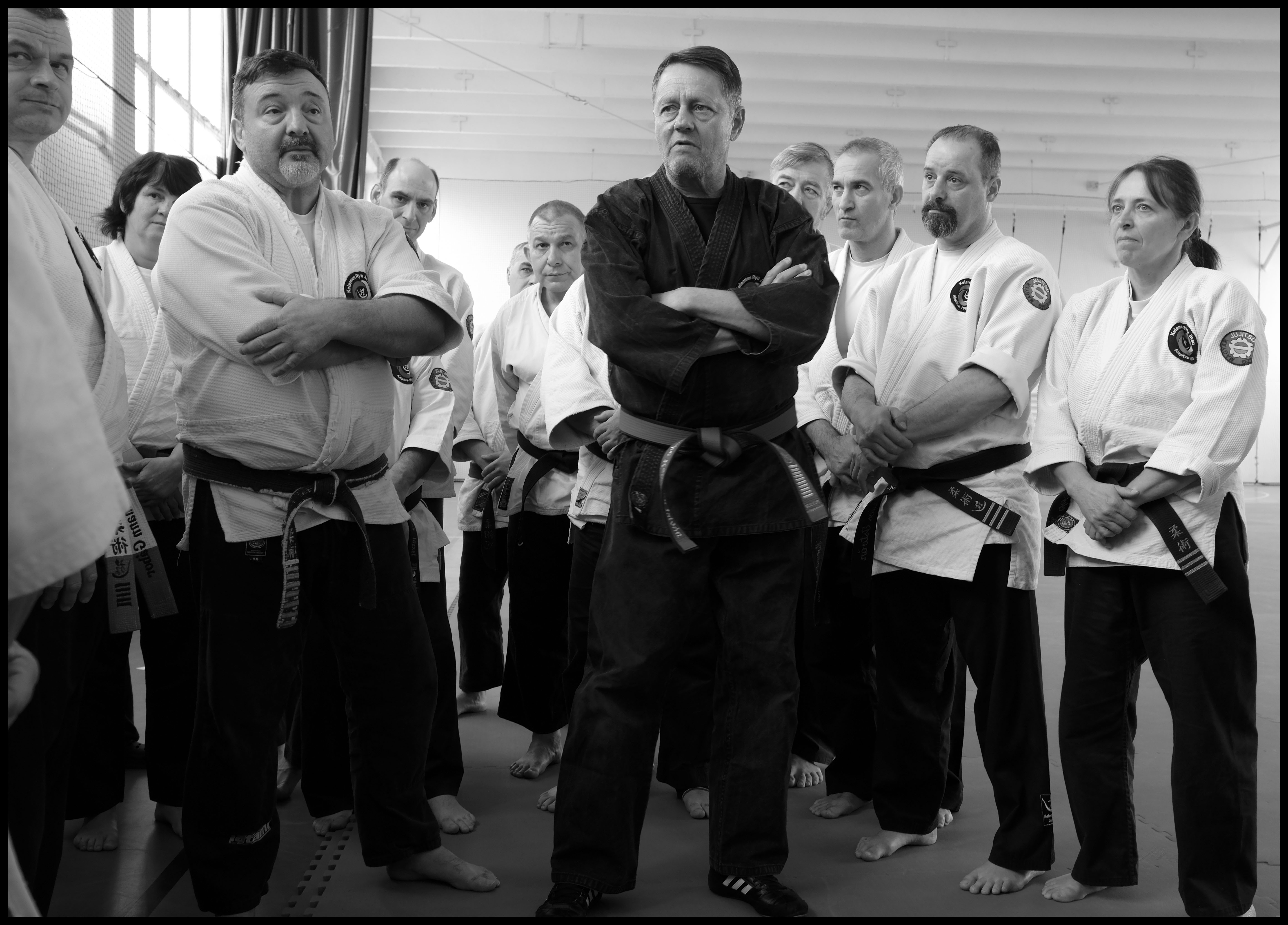 A hivatalos program péntek délután kezdődött, szokásosan a tatami lerakásával a tornateremben, majd négy órától elkezdtük az edzést. Soke Kelemen István kérésére elvileg könnyebb edzéssel kezdtünk – volna. A bemelegítést Shihan Kovács Attila tartotta – legyen elég erről a részről annyi, hogy a számos könnyed bemelegítő gyakorlat után nem mindegyikünk mosolya volt teljesen lazának mondható. Persze, nem is wellness-hétvégére jöttünk….:)